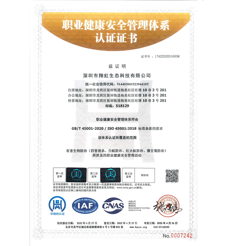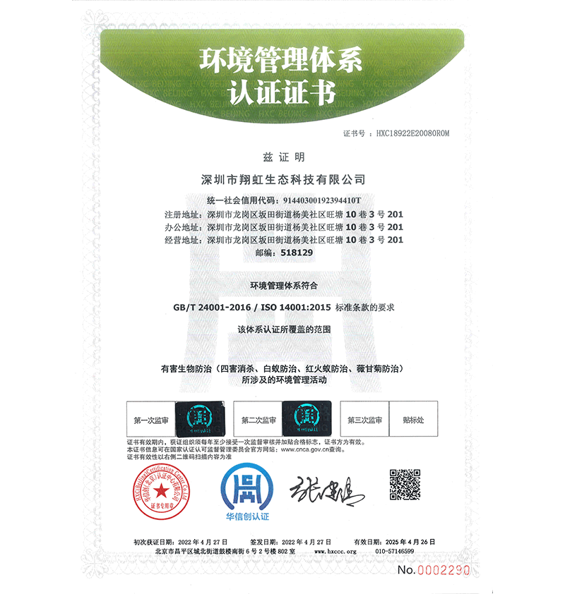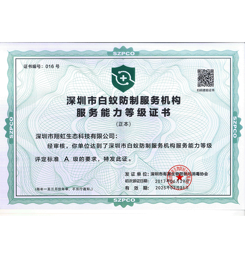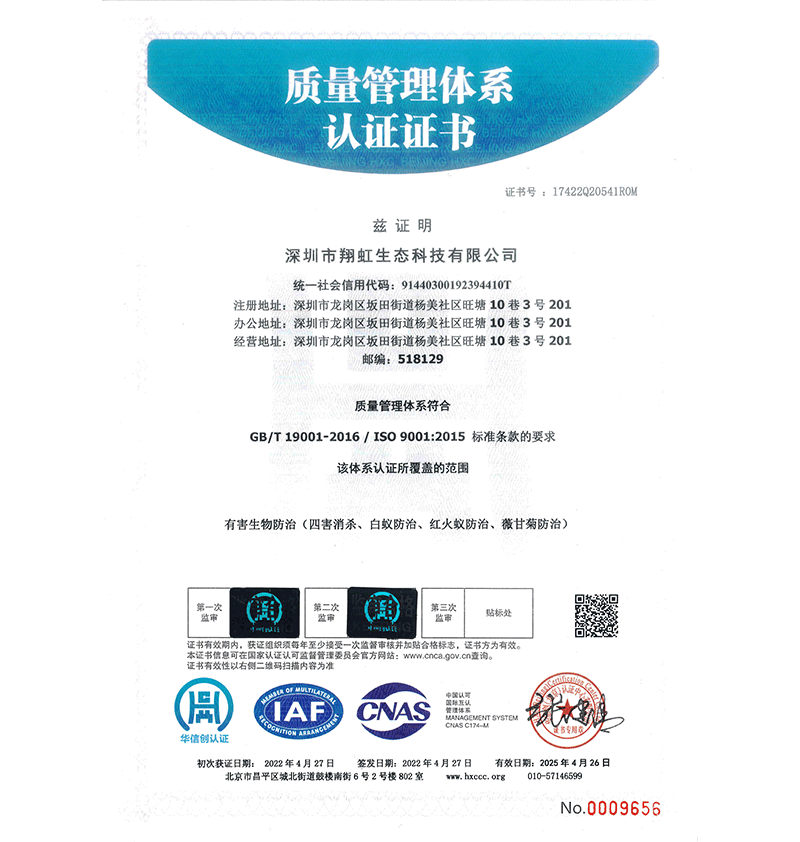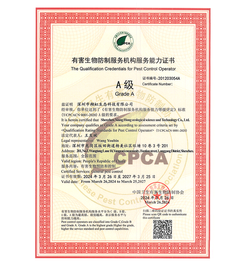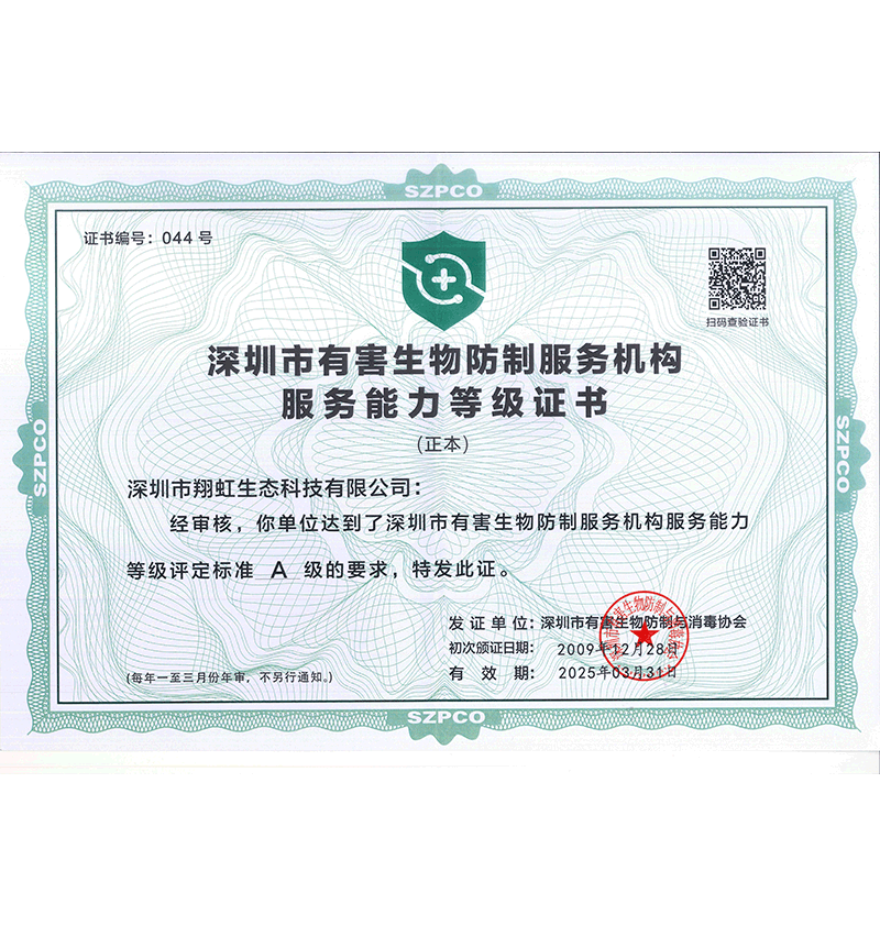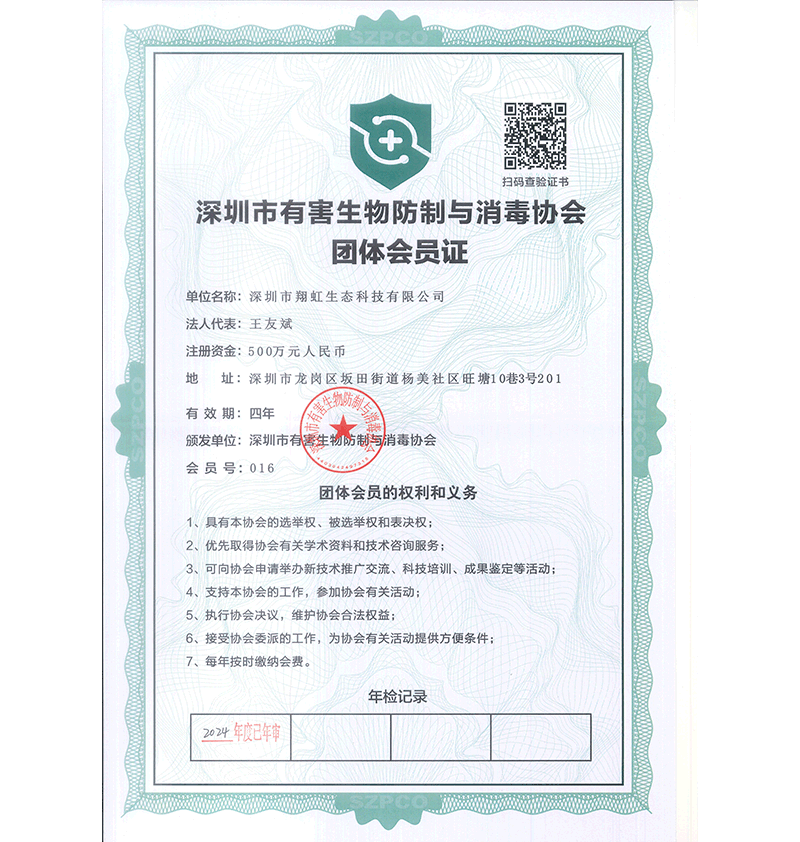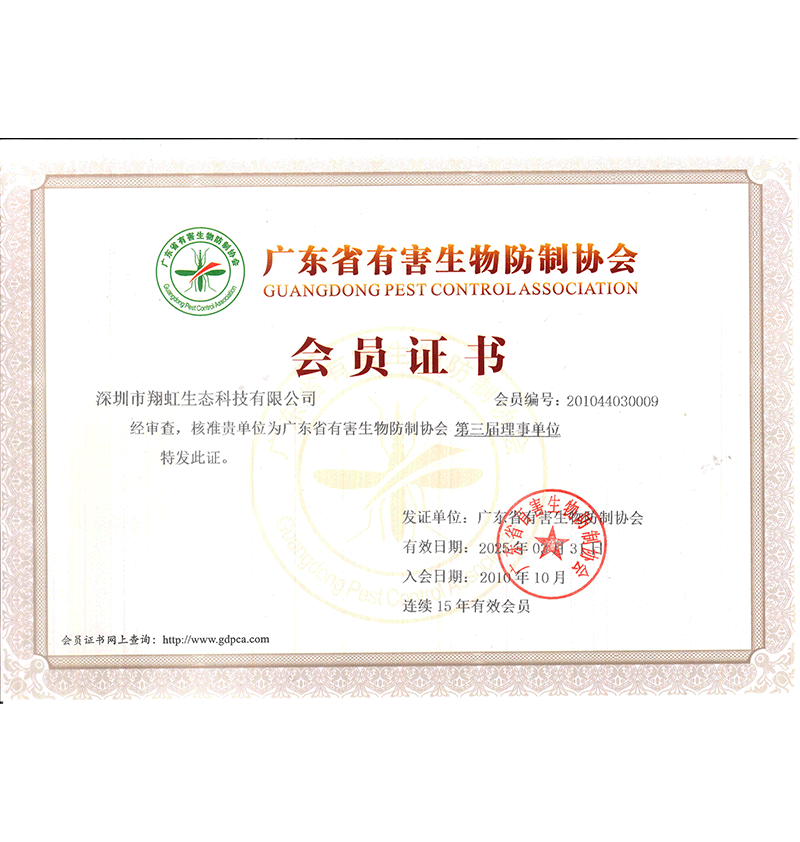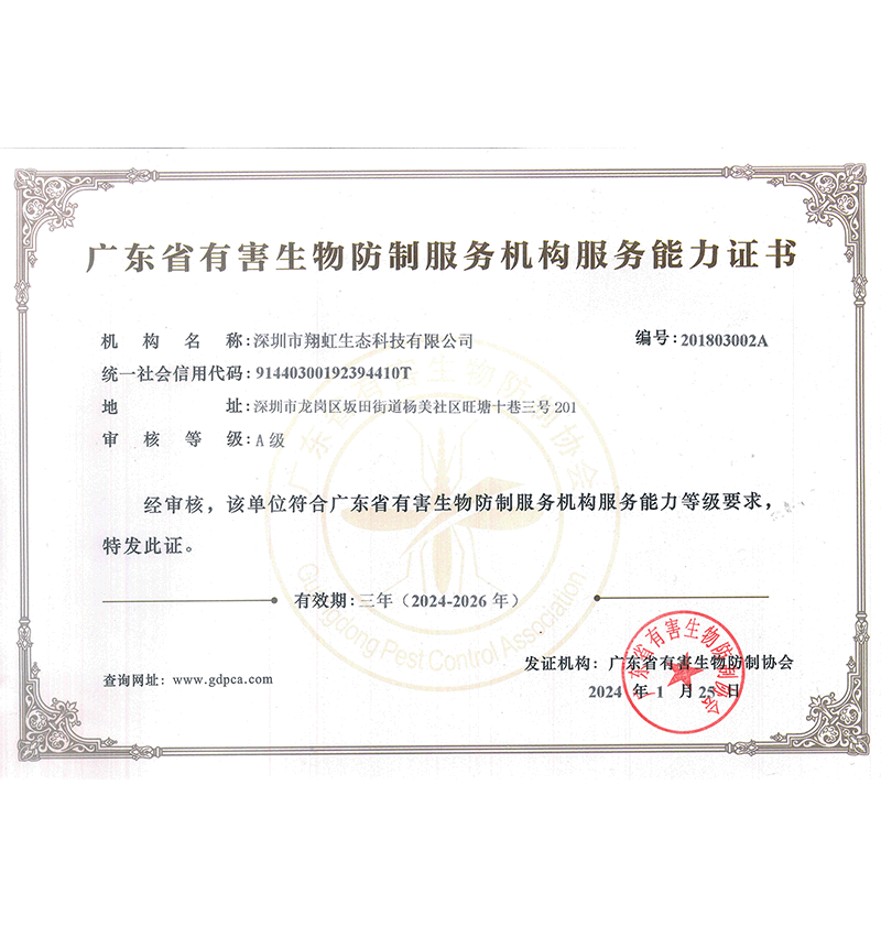 深圳市翔虹生態(tài)科技有限公司成立于1995年,是深圳最早成立的專業(yè)蟲害防治公司之一。公司發(fā)展至今獲得全國有害生物防制服務A級資質、廣東省有害生物防制服務A級資質、深圳市有害生物防制服務A級資質、廣東省有害生物防制服務A級資質、深圳市有害生物防制服務甲級資質的單位,是中國有害生物防治協會會員、廣東省有害生物防治協會會員、深圳市有害生物防治協會理事單位,多次獲得“深圳市十佳消殺單位”榮譽。